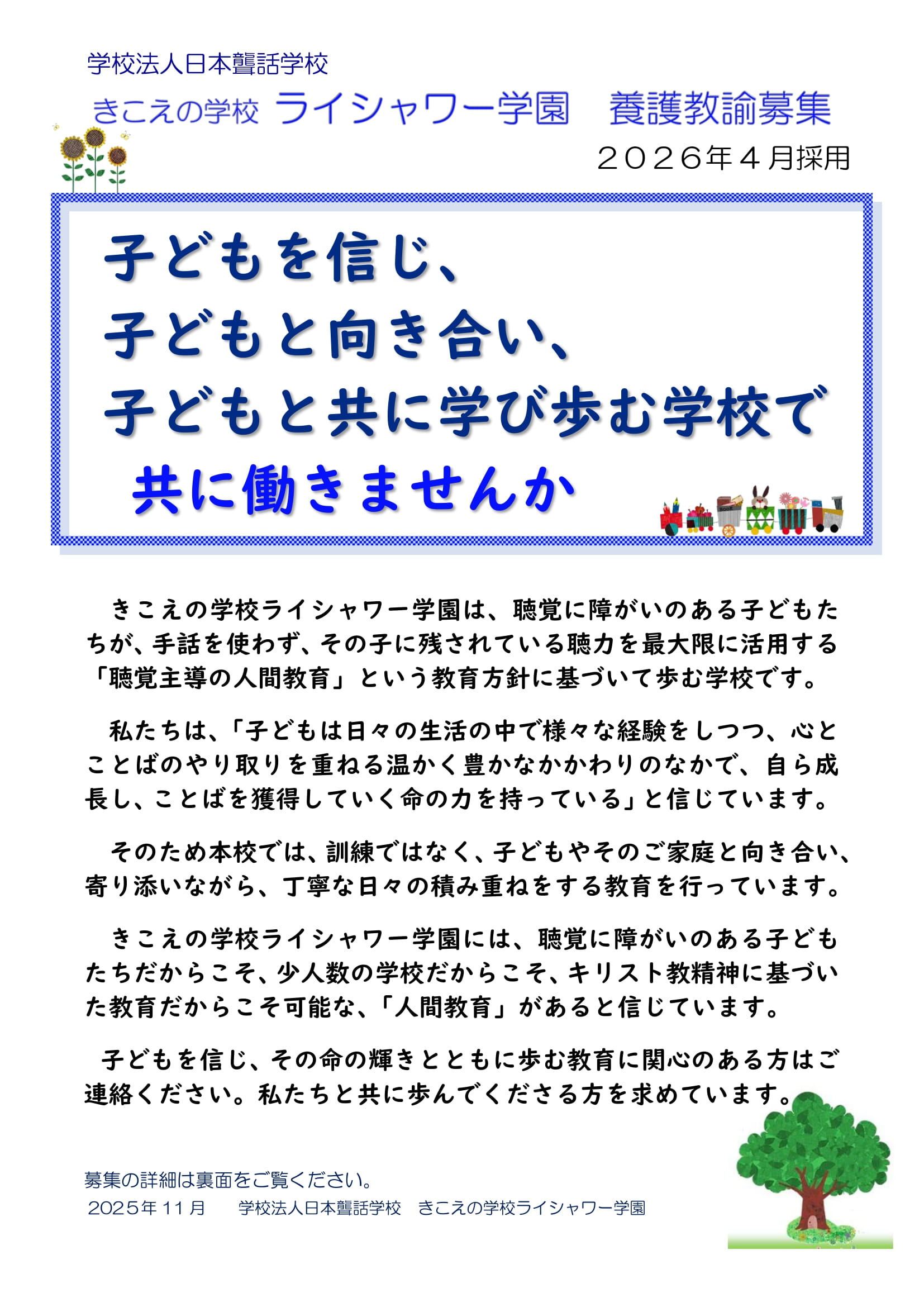 本校の「キリスト教精神に基づいた聴覚主導の人間教育」を共に担って下さる方を求めています。