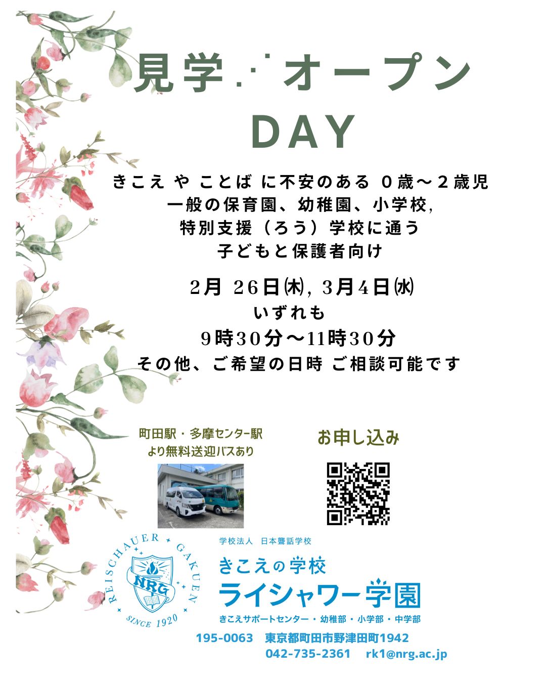 0歳~2歳児、一般の幼稚園、小学校、特別支援(ろう)学校に通う難聴児と保護者に向けた見学・相談オープンDAYを開催します。